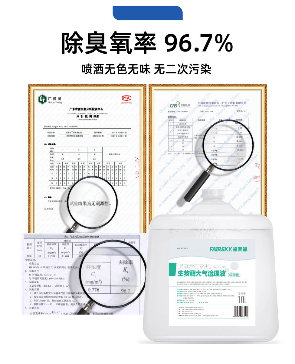 本產品為生物酶原料,做到產品安全性高,通過霧化技術處理,將生物酶臭氣凈化劑噴射在空氣中,酶分子可以有效吸附和捕捉環境和空氣中的臭氧分子,與其充分接觸,通過活性催化使臭氧分子快速分解為氧氣和氧離子。