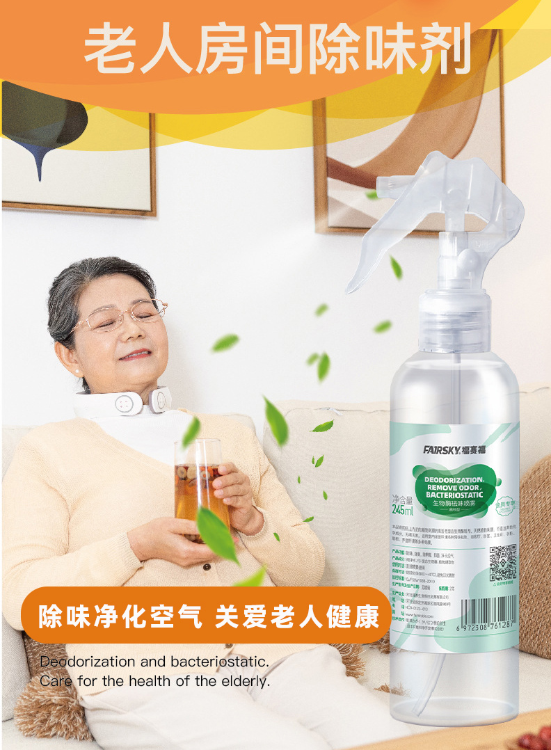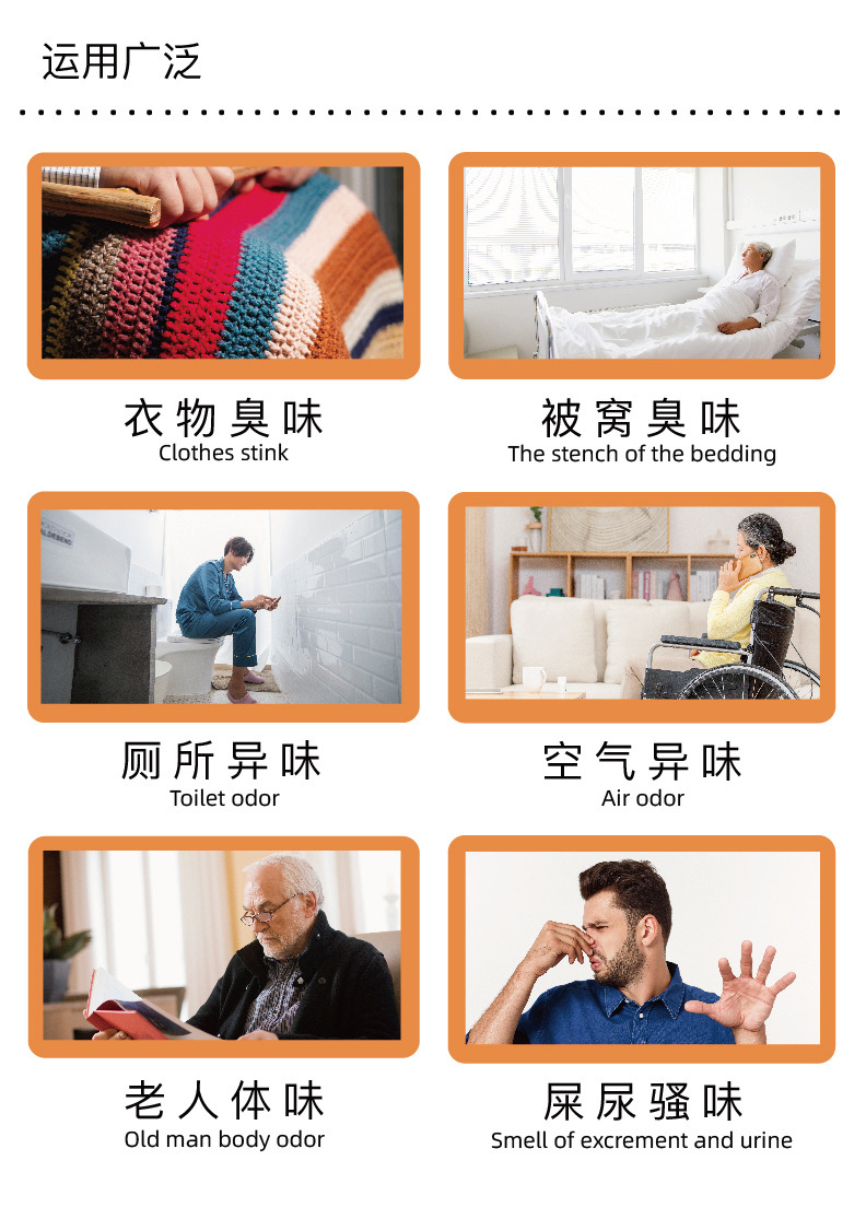 產品功能:專為解決老年人體味問題研發,本品以天然植物提取的酶活力物質為主要成分,復合濃縮天然植物精華素,針對老人體味、房間異味、衣物床單被褥異味、尿味等,有一定的分解抑制效果。