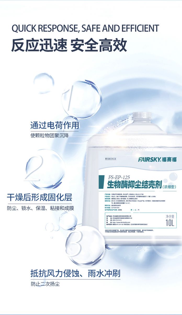 產品功能:針對礦區抑塵、城市道路、建筑工地抑塵治理,沉降空氣中顆粒物,凈化空氣,抑制揚塵,防止塵土飛揚。